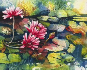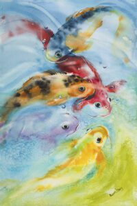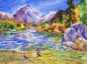 As a child, my dad would bring home large sheets of white butcher paper and jars of powdered tempura paint colors that we’d mix with water in empty tuna cans! I remember him giving me BIG paint brushes, encouraging wide, sweeping strokes, imagining puffy spring clouds, dark hidey holes, forest animals and always water. As a 3rd grader, I won my first 1st Place award from a Marin County All Cities Schools Annual Art Contest. It was a big tempura painting (yes, on butcher paper) of a white Pegasus horse with a black mane and tail, flying and cloud hopping through a child’s dream. I find joy in creating stories with watercolor that speak to people.